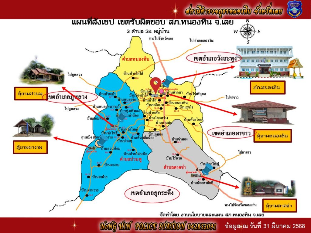 ทิศตะวันออก พื้นที่เขตรับผิดชอบของ อำเภอผาขาว แบ่งเขตรับผิดชอบด้วยแนวหมู่บ้านไร่ศรีอุบล หมู่ที่ 3 ตำบลหนองหิน