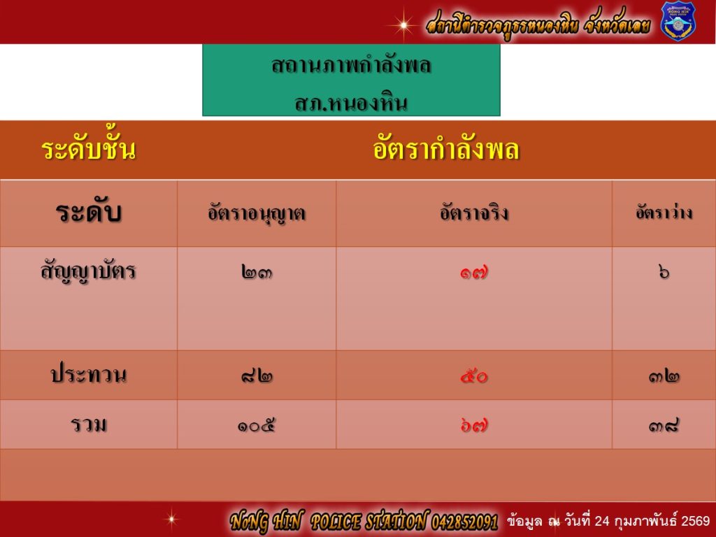 จำนวนประชากร 25,220 คน ตำรวจ 1 นายต่อประชากร 360 คน